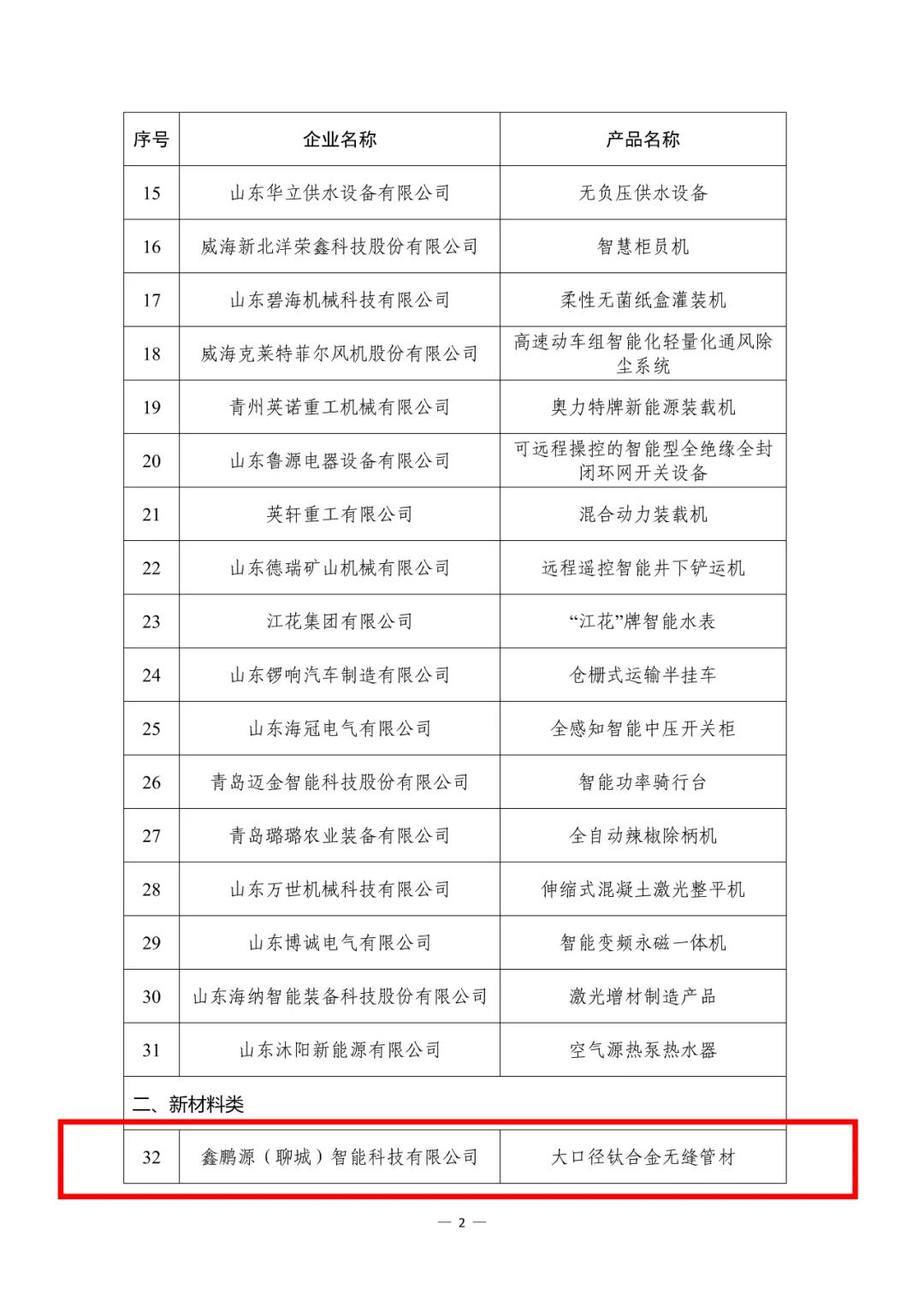 1.鑫鹏源(聊城)智能科技有限公司“大口径钛合金无缝管材”入选山东省工业和信息化厅2025年“山东制造·齐鲁精品”产品名单。